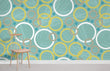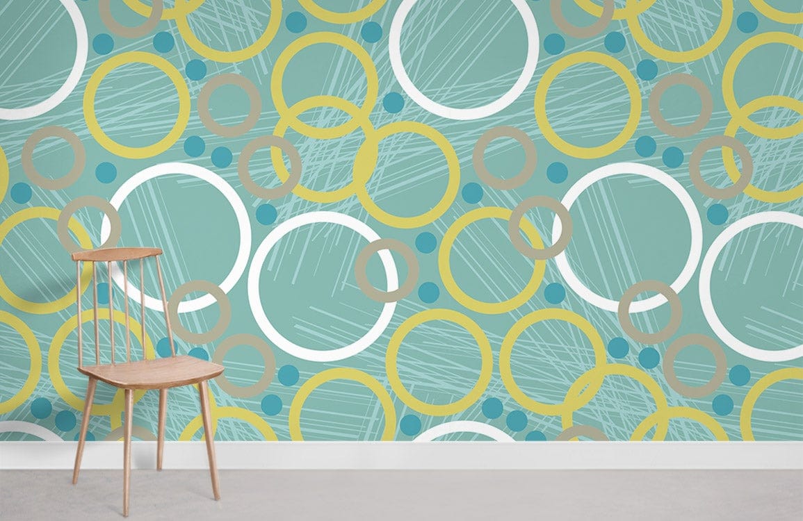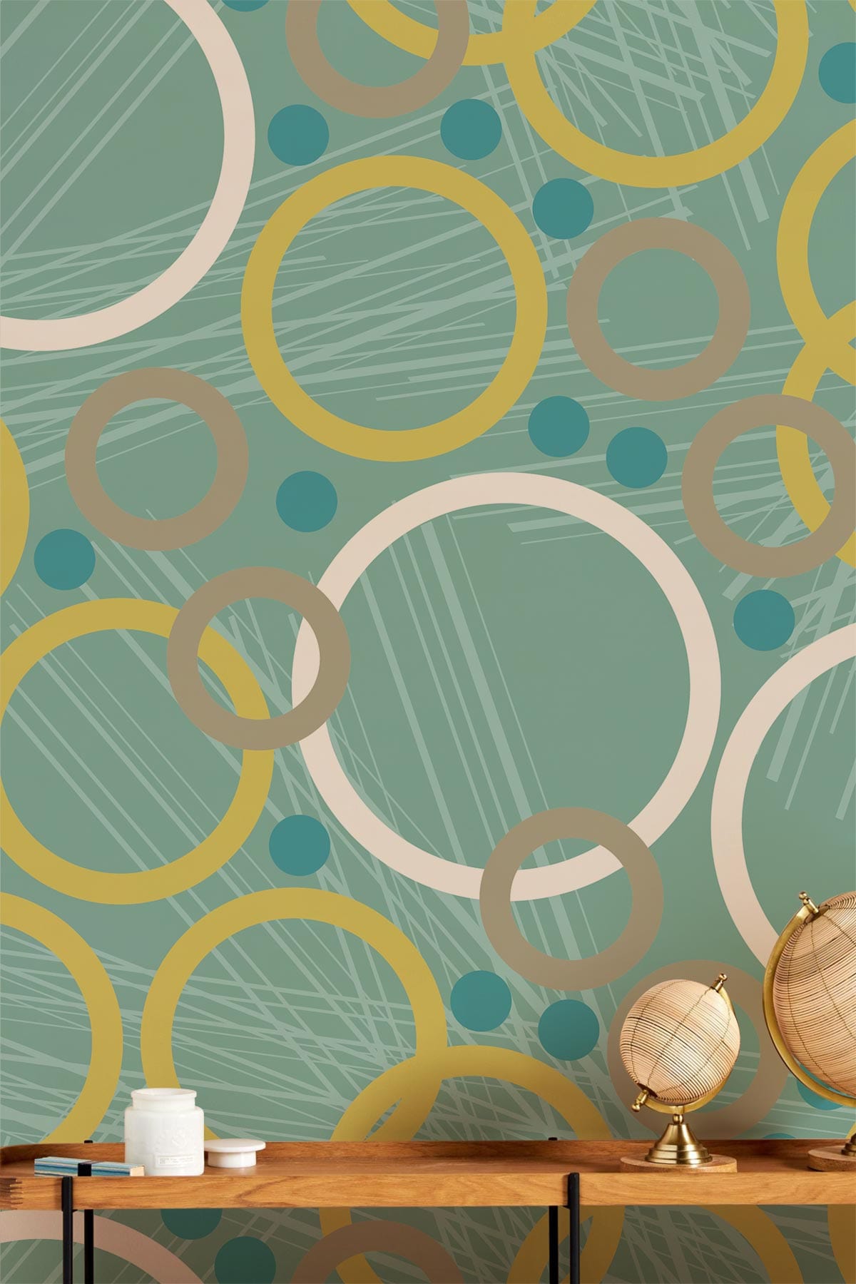 Enjoy the modernity and the trendy colours shades in this circle mural wallpaper with the mint green shade at the background. This pastel shade is on trend this year. Very vibrant designed mural and full colourful white and yellow circles pattern to give a widen scale to your place. It works perfectly in narrow areas. Use it in your living room for a new renovative looking and very modern effect. This design is perfect with modern and semi modern decorations. Use chiffon curtains and velvet couches for the best living room look!